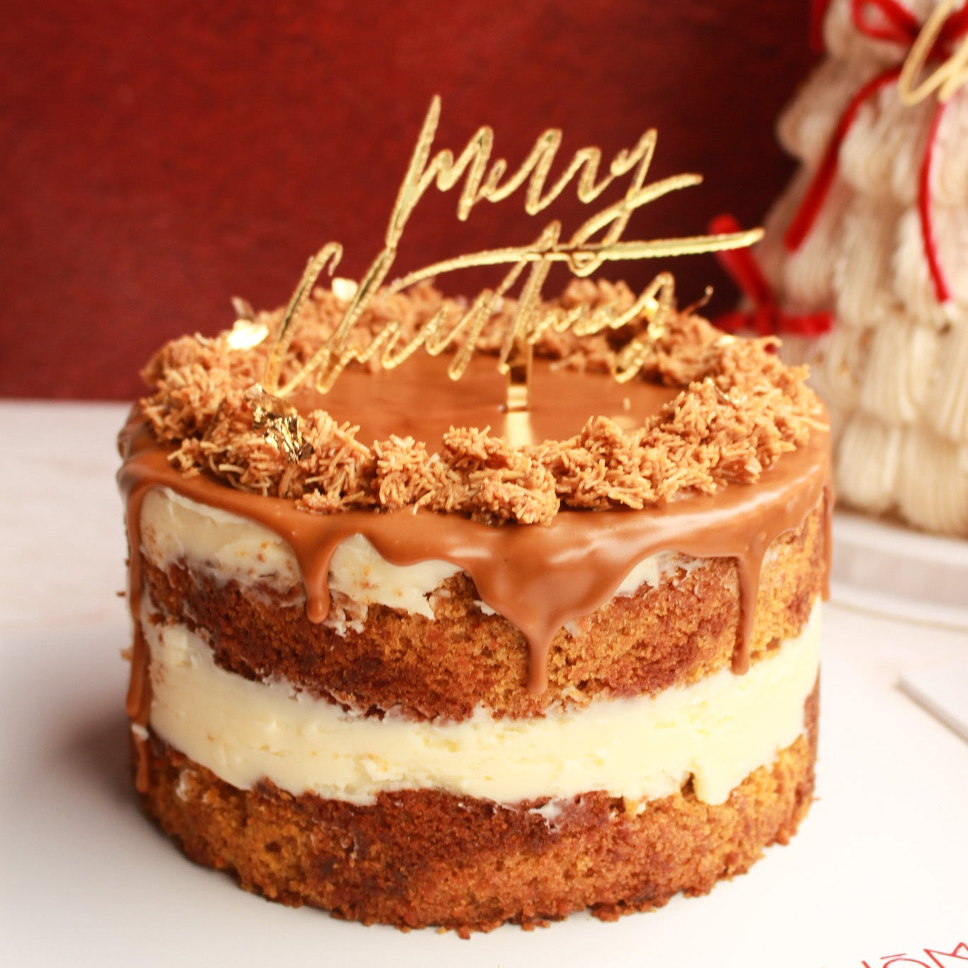 Pan de zanahoria super húmedo, relleno de queso crema y cookie butter, cubierto con betún de queso crema, cookie butter y galletas lotus.