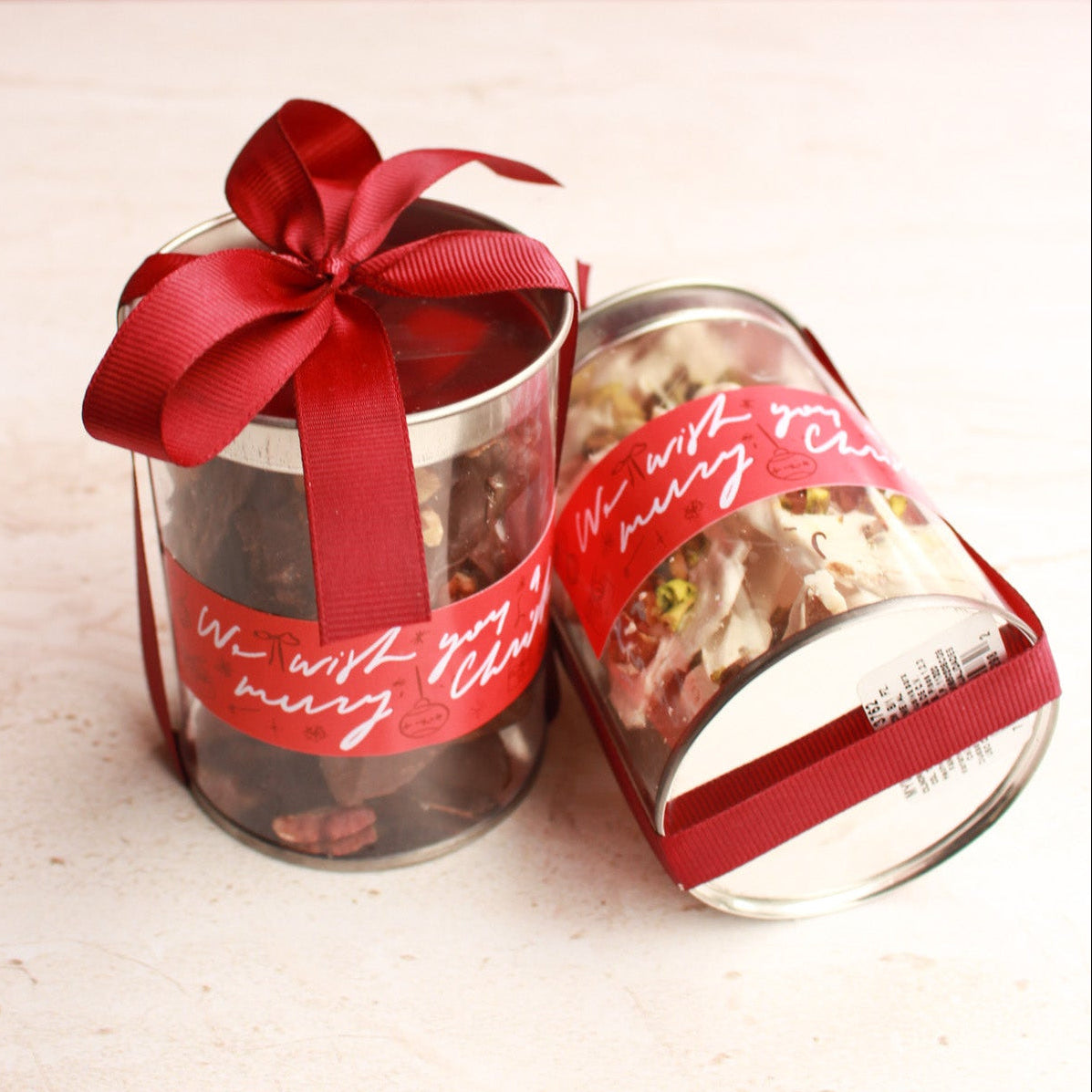 Toffee crujiente hecho a base de mantequilla cubierto con chocolate oscuro y nuez / chocolate blanco y pistache.